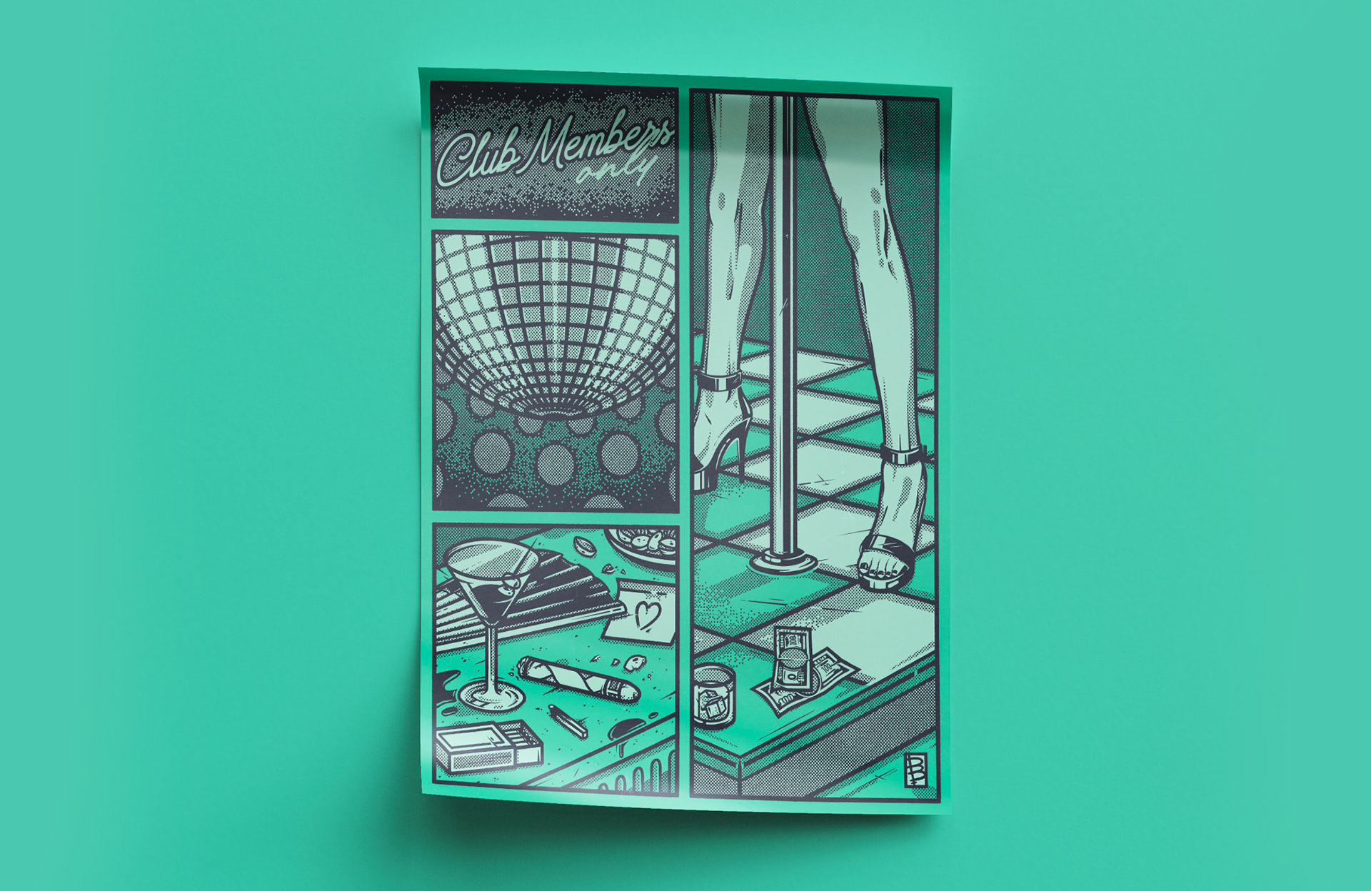 ‘Club Members Only’ Print (personal work), in 40x50cm size. Inspired by the 80s’ nightclubs a la Studio 54 or Paradise Garage, where Disco music introduces a brand new era of freedom, decadence, social revolution and sexual liberation.